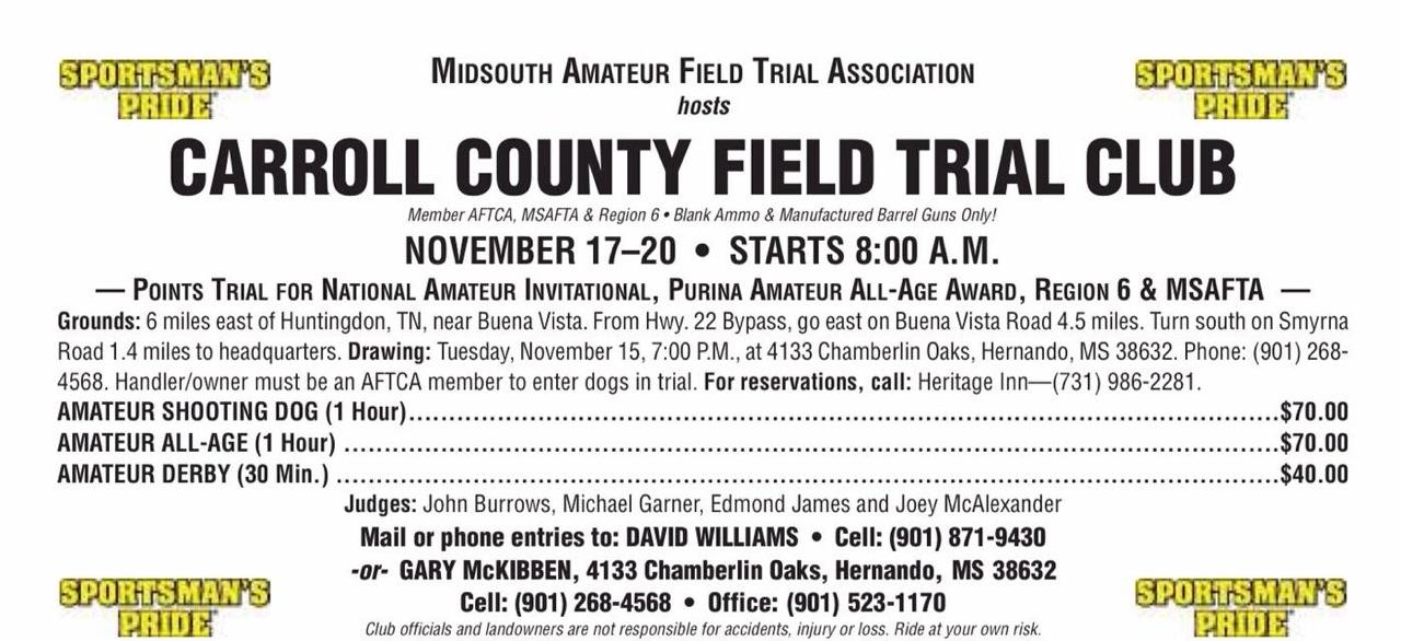The Carroll County trial that was scheduled for November 17 has been RESCHEDULED for March 16-19. The Fayette Co trial that was scheduled for March 16-19 has been replaced with the Carroll County trial. Please see original ad for details on the trial.