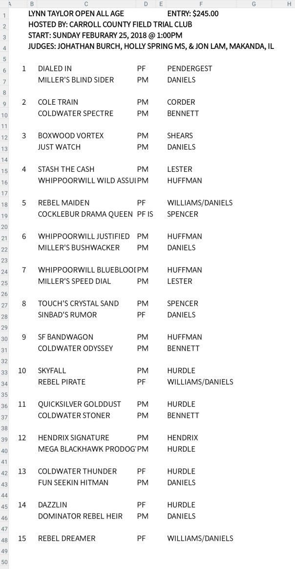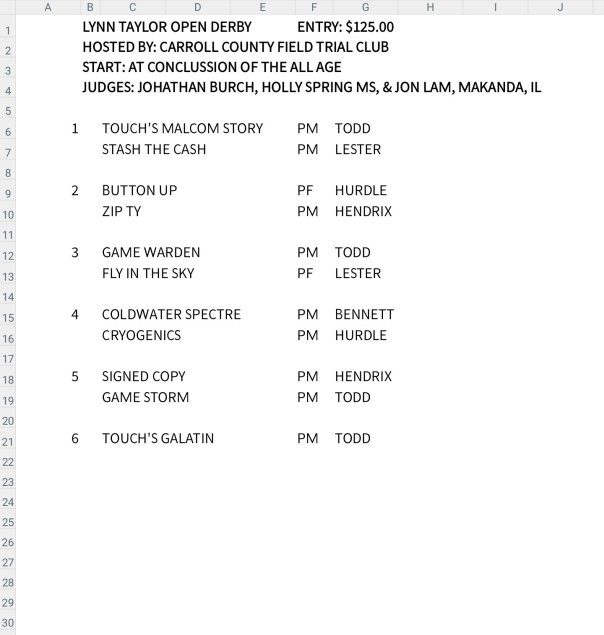 The Lynn Taylor Open All Age (Carroll County) will begin Sunday at 1 p.m. followed by the derby.