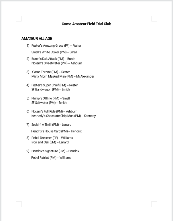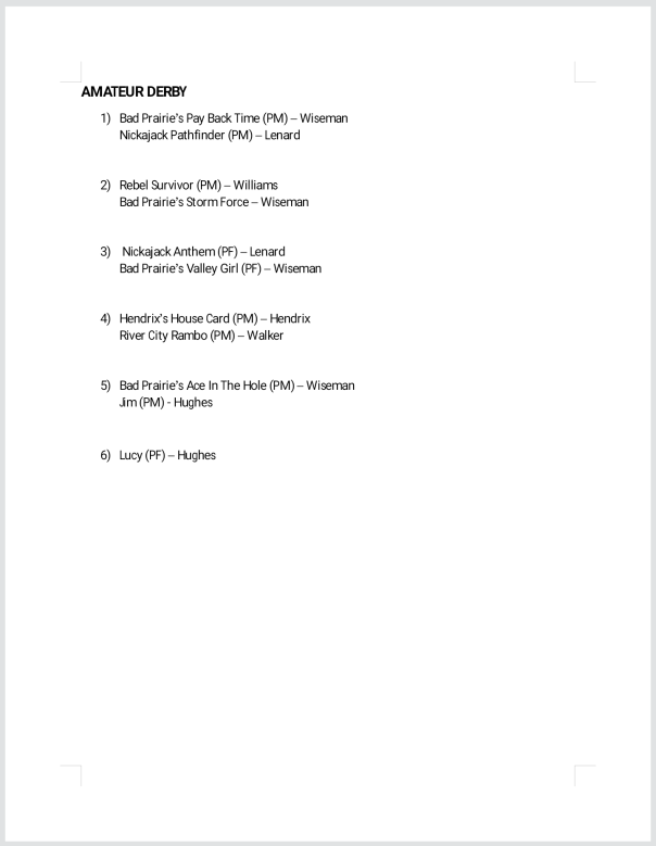 Como Amateur will start Friday at 8 am with the All-Age and will conclude Saturday with the Derby Stake. They will not Run on Sunday.