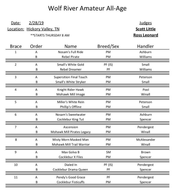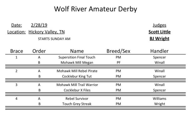 The Wolf River Amateur will start Thursday at 8 am with the All-Age. The Shooting Dog will run 1 brace on Friday pm and finish on Saturday. The Derby will start Sunday at 8am.