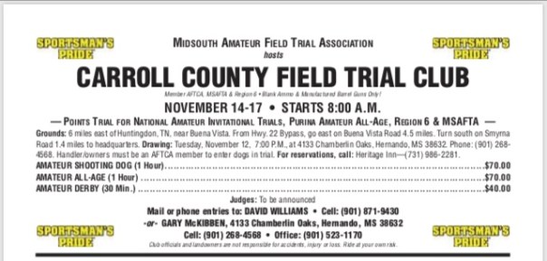 The Carroll County FTC Amateur Trial drawing will be on Tuesday, November 12th. Mail or phone entries to David Williams or Gary McKibben.