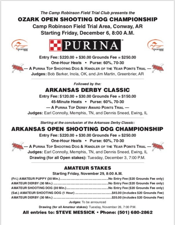 Amateur Shooting Dog and Derby Stakes is scheduled to start Friday, November 29th at 9 am. Drawing will be Tuesday, November 26th at 7:00 pm. All entries to Steve Messick, phone (501) 680-2862.