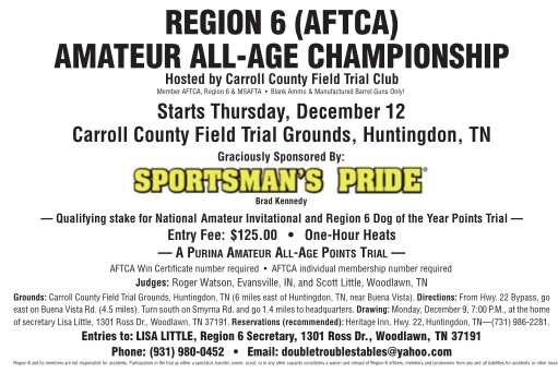 The drawing for the Region 6 All-Age Championship will be Monday, December 9th at 7 pm. This championship will be held on the Carroll Co. Grounds in Huntingdon, TN. You may call or text your entries to 931-980-0452 or by email to doubletroublestables@yahoo.com. Looking forward to a fun and exciting championship event.