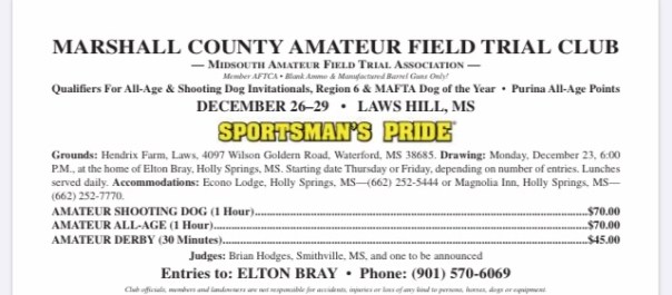Just a friendly reminder that the Marshall County FTC Amateur trial drawing will be on Monday, December 23rd at 6 pm. Contact Elton Bray with your entries.