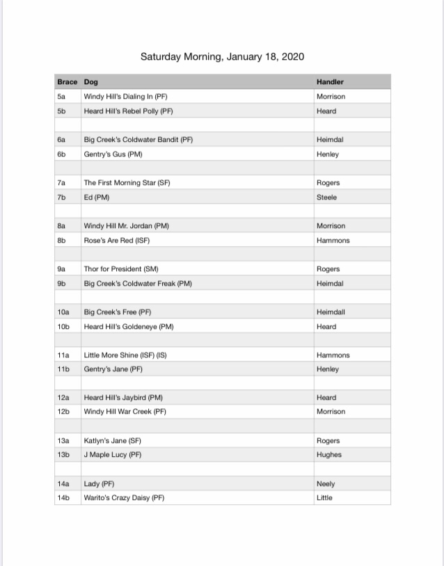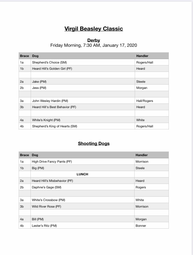 Virgil Beasley Classic Shooting Dog and Derby Stakes running order. Trial begins at 7:30 am on Friday.