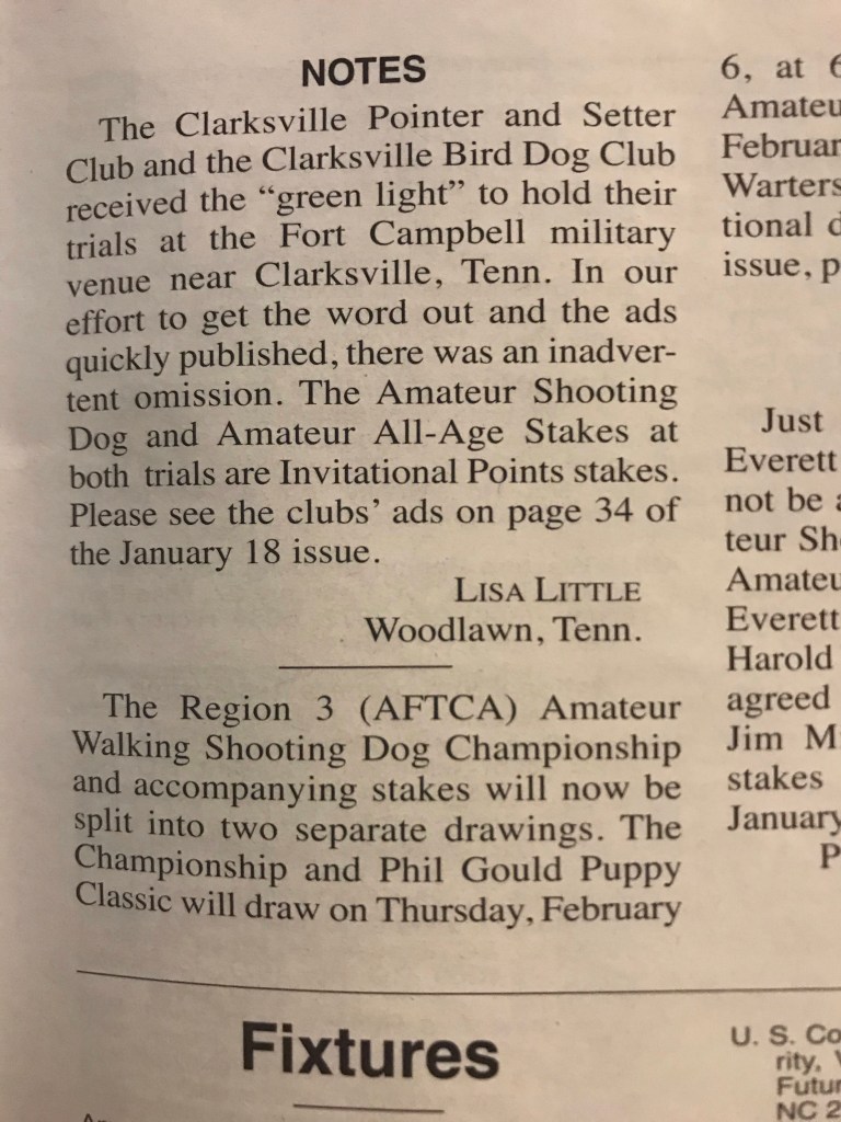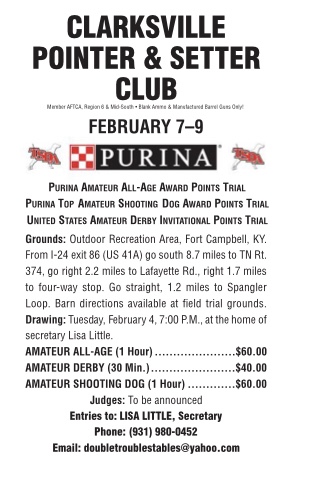 Just a friendly reminder that the Clarksville & Setter Club Trial drawing will be Tuesday, February 4th, at 7 pm. Contact Lisa Little with your entries. Judges are as follows: All-Age Stake – Roger Watson and Scott Little, Derby Stake – Roger Watson and Betty Shearouse, and Shooting Dog Stake – Pete Glass and Chris Cagle