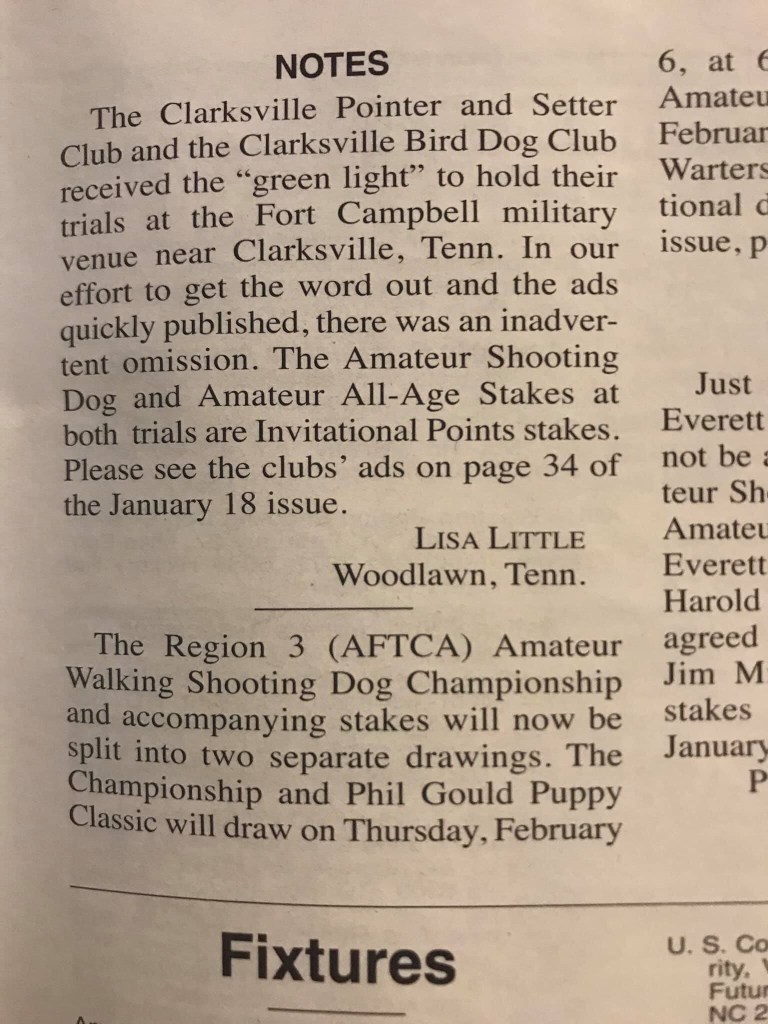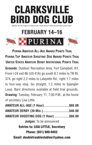 Just a friendly reminder that the Clarksville BirdDog Club Amateur Trial drawing is Tuesday, Feb. 11th at 7 pm. Contact Lisa Little with your entries.