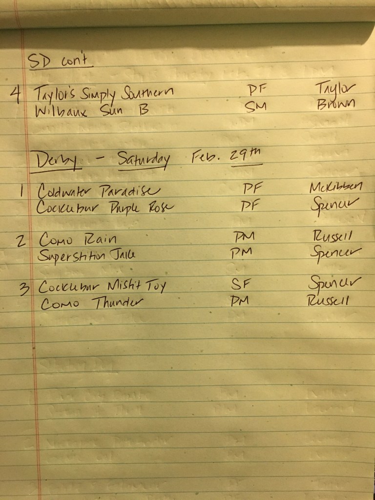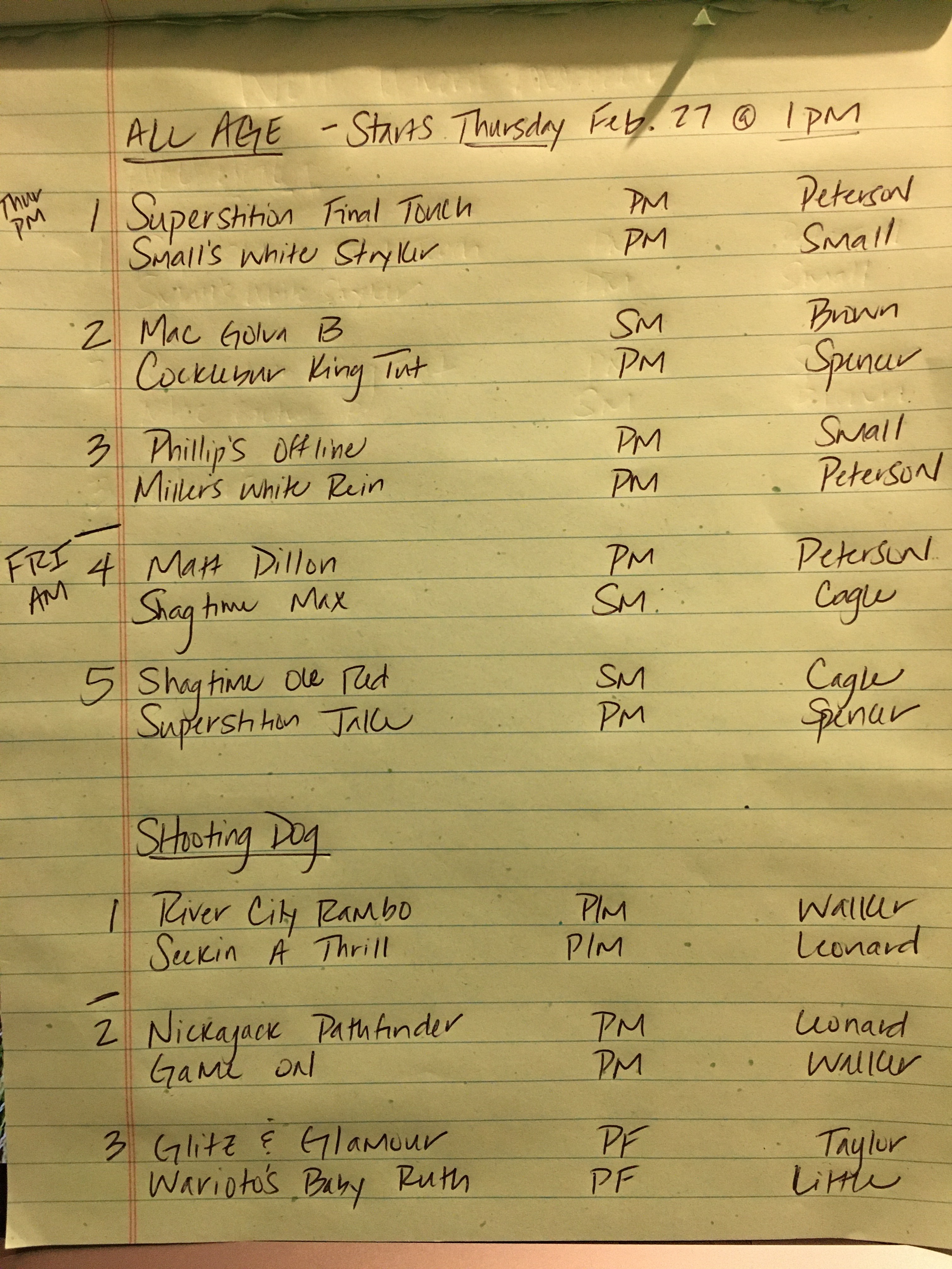 We will start All Age Thursday at 1 p.m. All Shooting Dogs will run Friday and Derby will run Saturday.