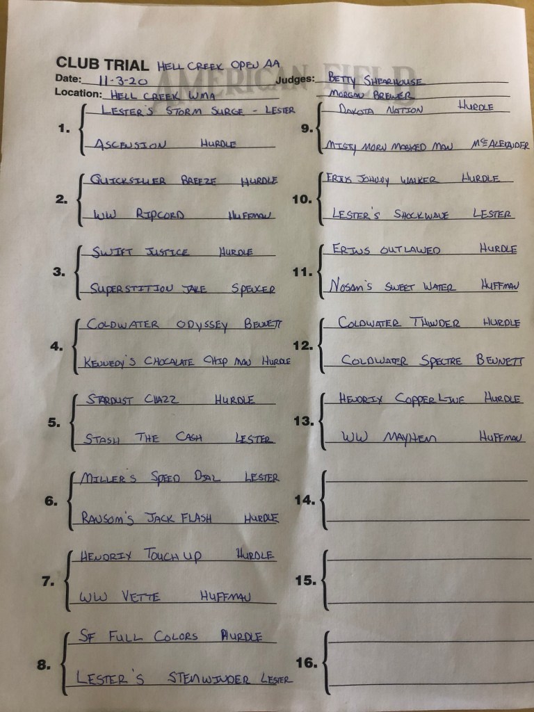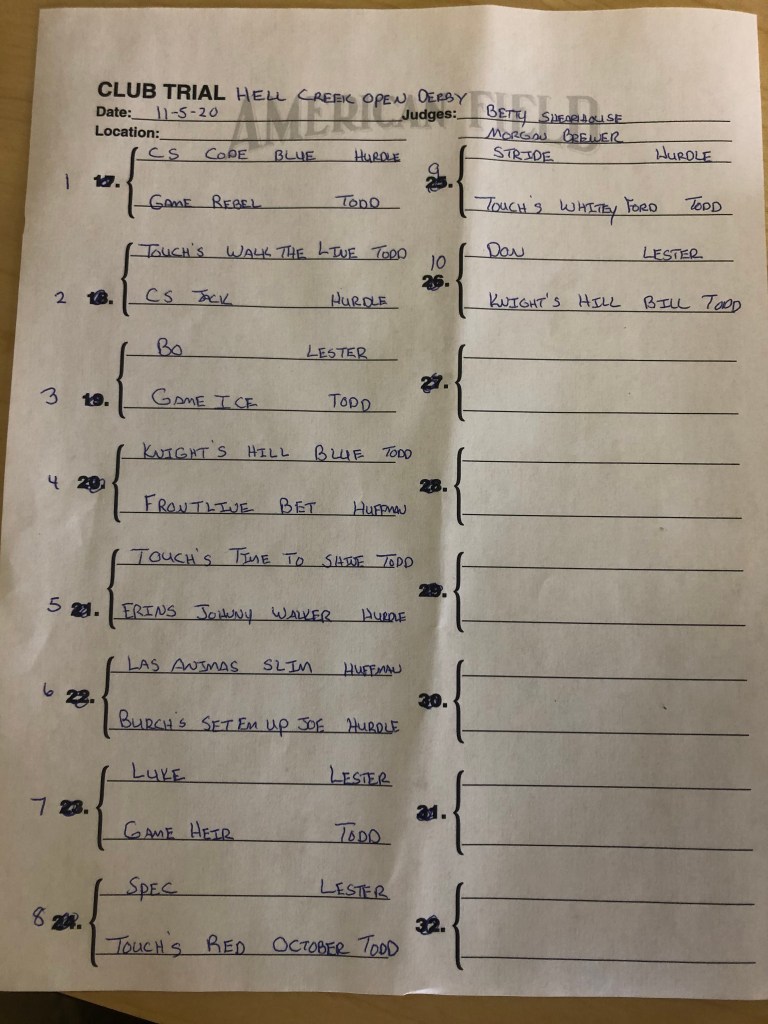 Hell Creek FTC Open All-Age and Derby running order, trial starts Tuesday, November 3rd.