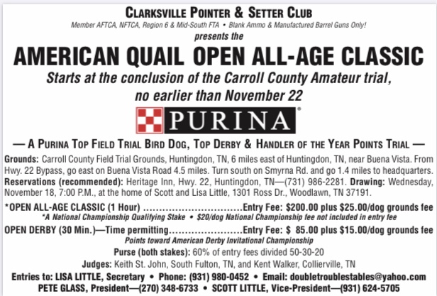 The American Quail Classic Open All-Age and Derby Trial will start at the conclusion of the Carroll Co. FTC Amateur Trial. The drawing will be held Wednesday, Nov. 18th, contact Lisa Little with your entries