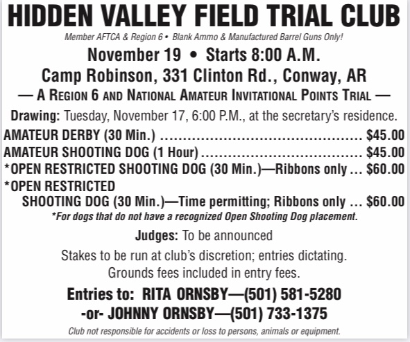 The Hidden Valley FTC will hosts its Amateur and Open Restricted Trial starting November 19th, contact Johnny or Rita Carroll Ornsby with your entries.
