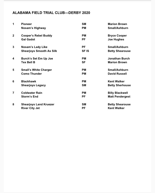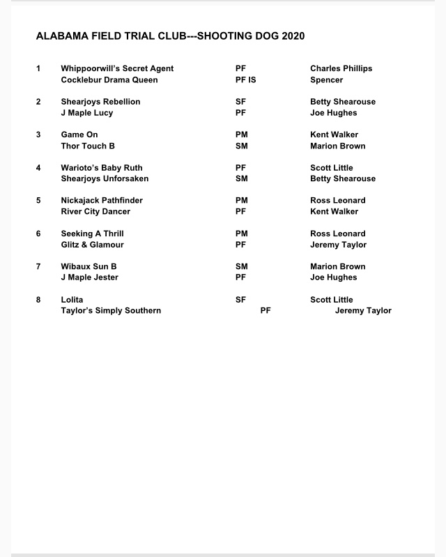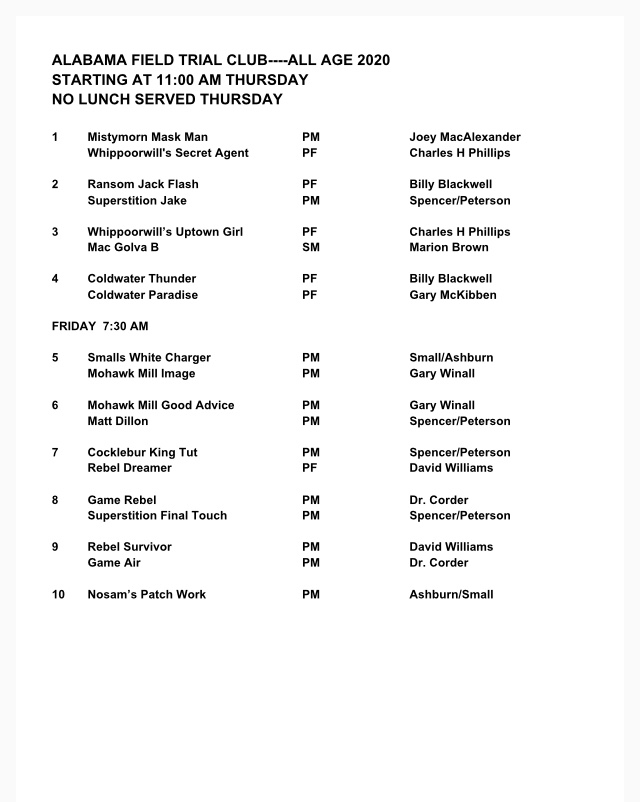 Alabama FTC Amatuer Trial running order. Trial will be held at Hell Creek WMA in Blue Mountain, MS