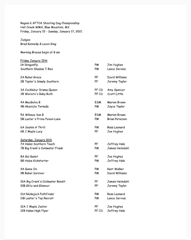 Region 6 Shooting Dog Championship running order. The trial will begin at 8 am on Friday. Safe travels and the best of luck to all competitors!