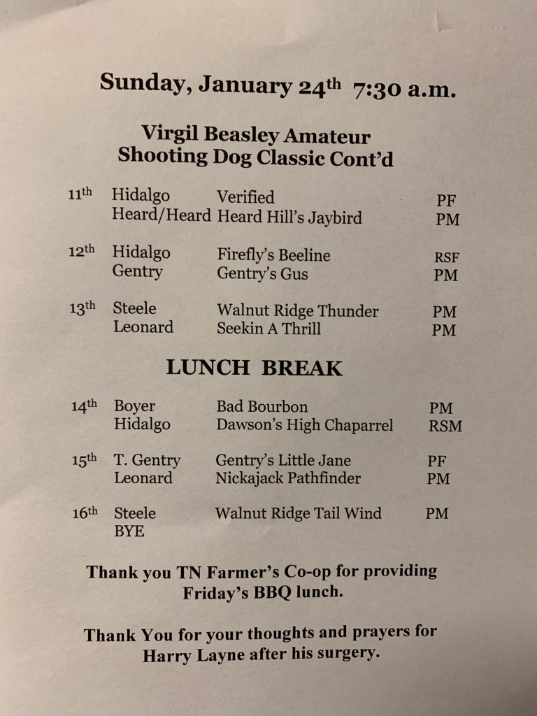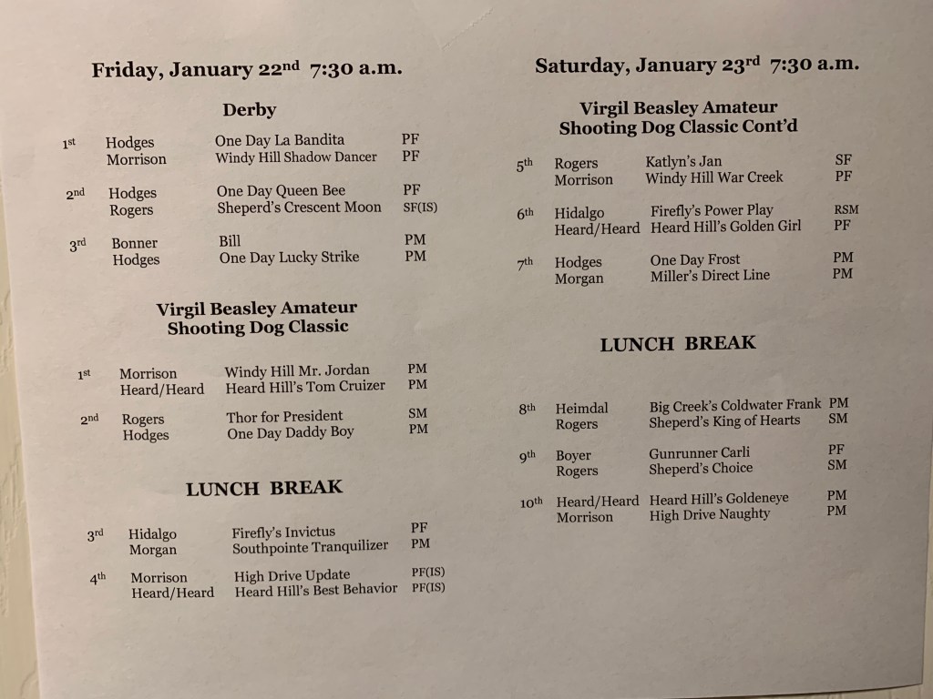 Old Hickory FTC and Virgil Beasley Amatuer Shooting Dog Classic running order. The trial begins on Friday, January 22nd. Best of luck to all the contenders!