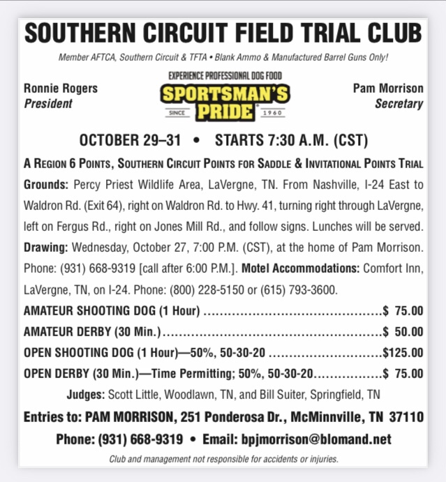 Make sure to add the Southern Circuit Field trial club’s amatuer and open trial to your schedule of events. The drawing for the trial will be on Wednesday, October 27th, contact Pam Morrison with your entries, see ad below for particulars.