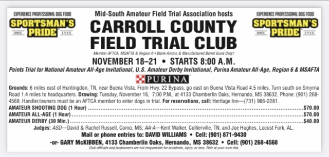 The Carroll Co. FTC Amateur trial will run Nov. 18- 21. The drawing is on Tuesday, Nov. 16th at 7 pm. Contact Gary McKibben with your entries. Please see particulars in ad below.