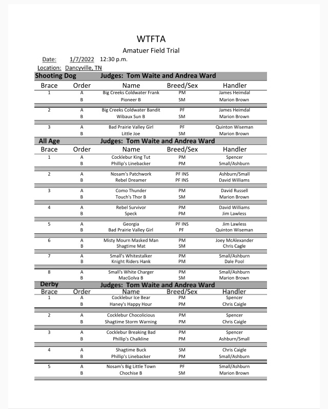 West TN FTC Amateur trial running order is attached. The trial will start Friday at 12:30 with the Shooting Dog Stake. The All-Age will begin Saturday morning. Wishing each competitor the best of luck in Dancyville!