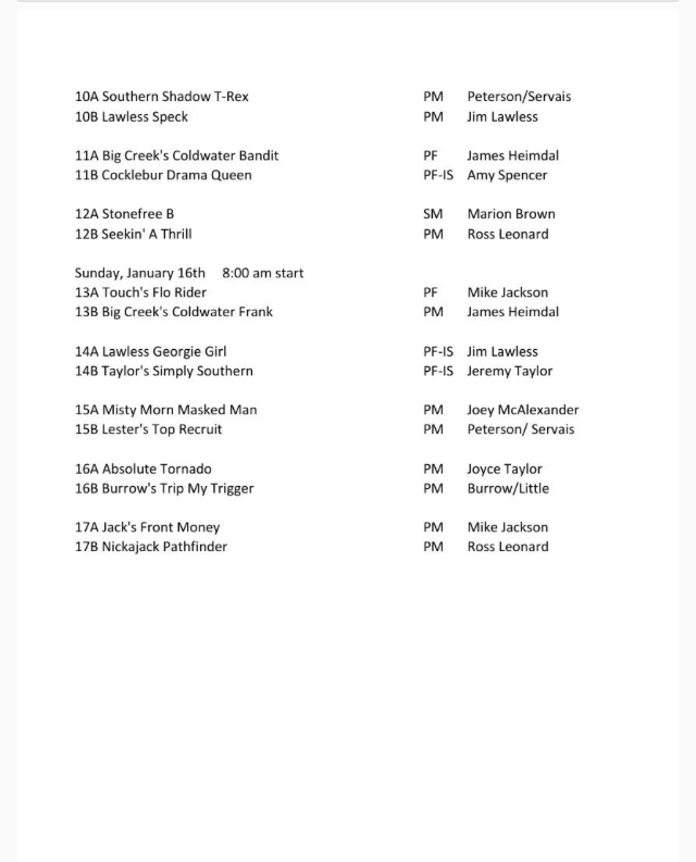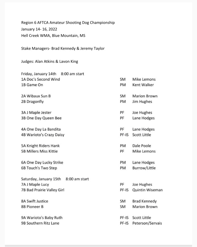 Region 6 Amateur Shooting Dog Championship running order. The trial will begin at 8 am on Friday, January 15th. We would like to all the handlers for their entries. Wishing everyone the best of luck. Thank you to Sportsman’s Pride for the sponsorship of this trial.