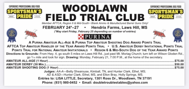 The drawing for the Woodlawn FTC will be on Monday, Feb. 21st at 7 pm. Please contact Lisa Little with your entries. Please note that this amateur trial is being held at Hendrix Farms this year thanks to the graciousness of Guy Hendrix and Burke Hendrix