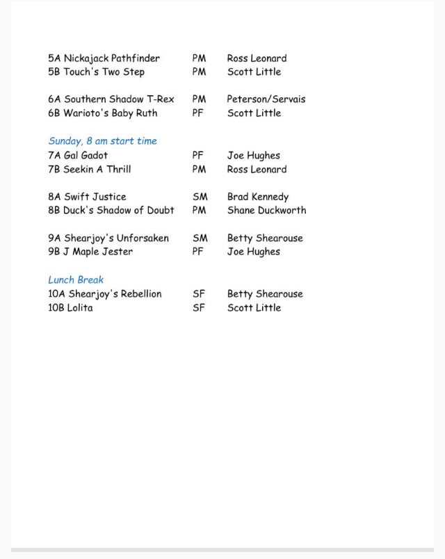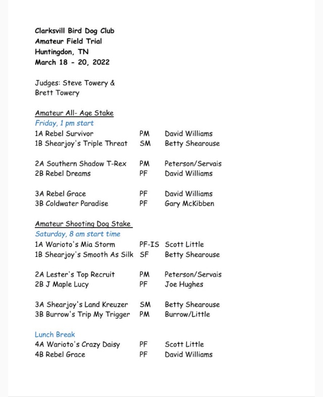 Thank you to all the competitors for their entries. Below is the Clarksville Bird Dog Club running order, trial will be held in Huntingdon, TN at the Carroll County grounds. We will begin with the Amateur All- Age stake on Friday, followed by the Amateur Shooting Dog Stake starting on Saturday. Due to low entry numbers we will no have an Amateur Derby stake.