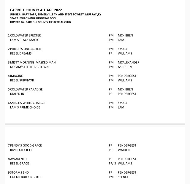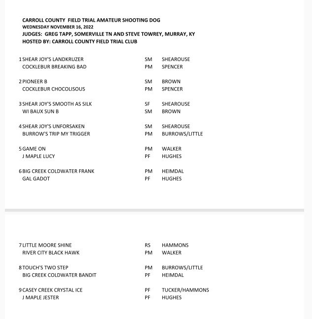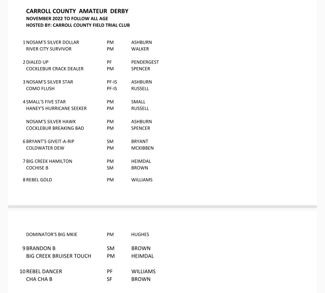 Carroll Co. FTC Amateur trial running order. The trial will begin on Wednesday at noon with the Shooting Dog Stake, followed by the All-Age stake, and ending with the Derby Stake. Wishing each competitor a great brace! This trial is graciously sponsored by Sportsman’s Pride. #SportsmansPride #aftca #ukcdogs #dogsthatdomore #region6aftca #fieldtrials #birddog