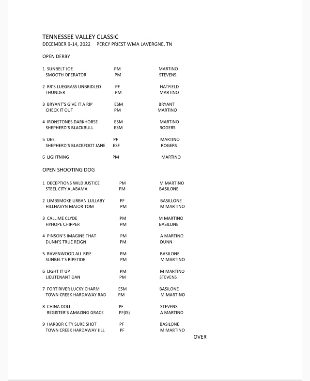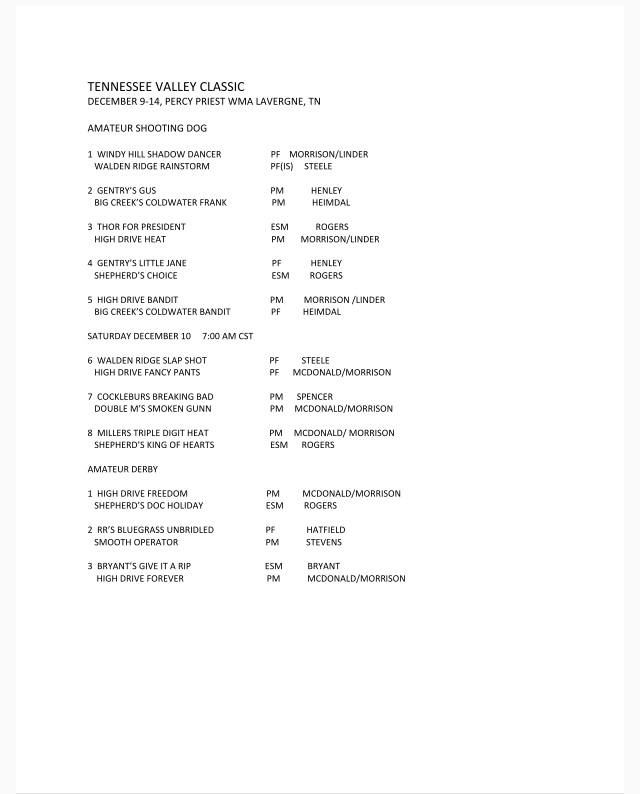 The running order for the Tennessee Valley FTC Amateur and Open trial is below. Trial will begin with the Amateur Shooting Dog Stake on Friday, December 9th