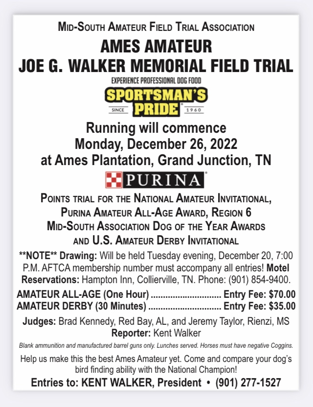 The drawing for the Ames Amateur All-Age and Derby stakes will be on Tuesday, Dec. 20th. This trial fills up fast, contact Kent Walker with your entries