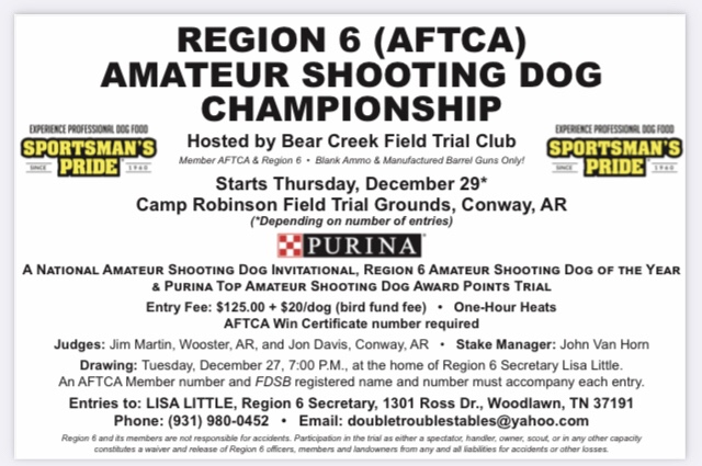 The drawing for the Region 6 Amateur Shooting Dog Championship will be on Tuesday, Dec. 27th. Please contact Lisa Little with your entries. A special thanks to Sportsman’s Pride for their sponsorship of this championship trial. #SportsmansPride #aftca #ukcdogs #dogsthatdomore #region6aftca #fieldtrials #birddogs