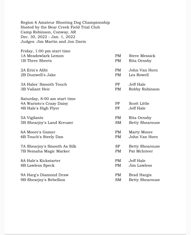 The Region 6 Amateur Shooting Dog Championship will begin on Friday, December 30th at 1 pm. The running order is pictured below. We would thank the Bear Creek Field Trial Club for serving as the host club. A special thanks to Sportsman’s Pride for their sponsorship. #SportsmansPride #aftca #ukcdogs #dogsthatdomore #region6aftca #fieldtrials #birddog Best of luck to all the competitors!!
