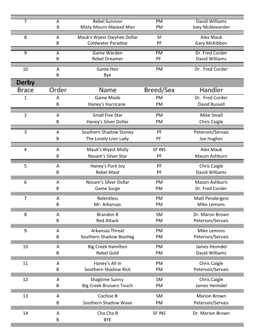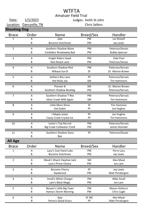 West TN Amateur Field Trial running order is attached below. Trial will begin at 8:00 am on Thursday. Best of luck to all the contenders!!