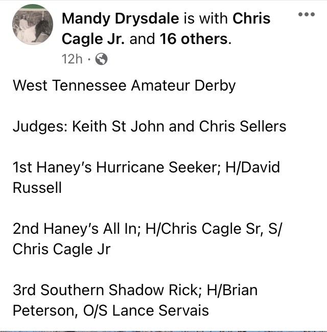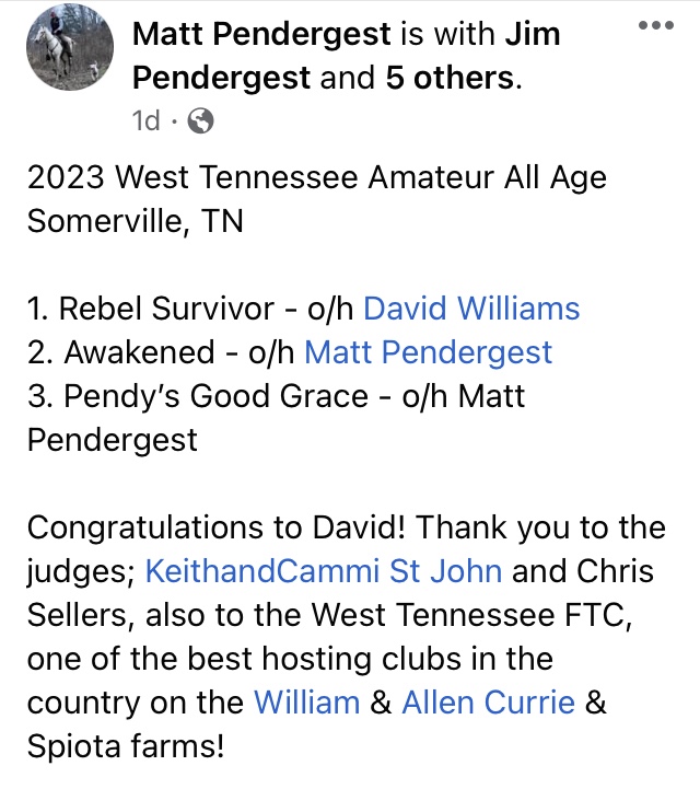 West Tennessee Field Trial Amateur Stake winners. Thank you to Matt Pendergest and Mandy Drysdale for posting on their personal pages