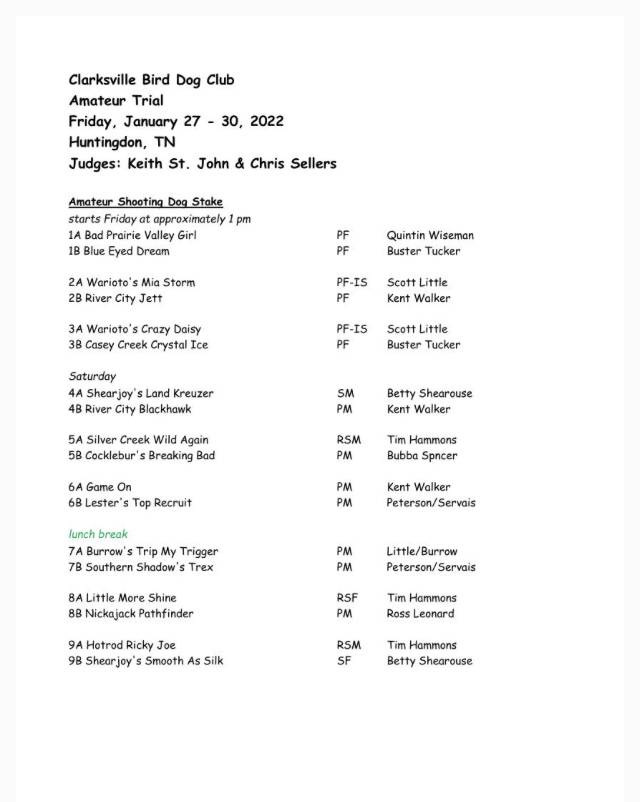 Please find attached below the running order for the Clarksville Bird Dog Club amateur trial. We will begin on Friday after lunch with the amateur shooting dog stake, followed by the amateur all-age stake. Safe travels and best of luck to each entry! #region6aftca #aftca #fieldtrial #birddog #ukcdogs #DogsThatDoMore