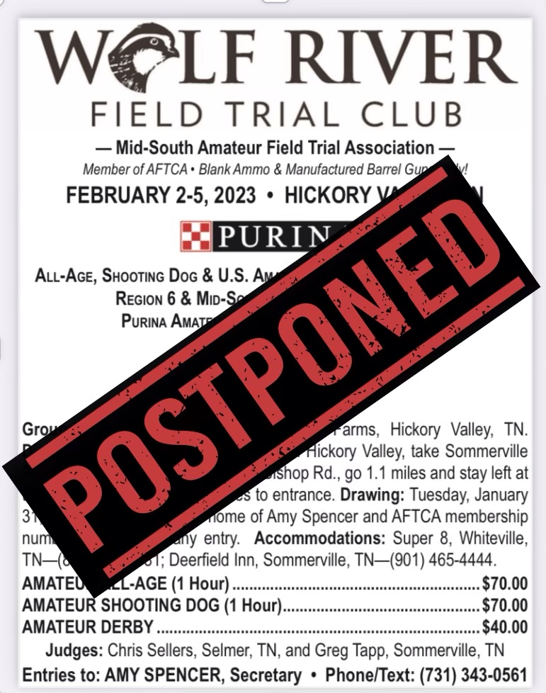 Due to unsafe ground conditions the Wolf River FTC Amateur Trial will be postponed until Feb 16th – 19th. Please note this change in your calendar and plan to compete on the revised dates