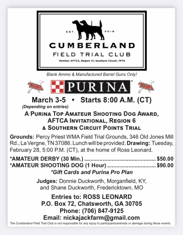 The drawing for the upcoming Cumberland FTC is on Tuesday, Feb. 28th at 5:00 pm. Please contact Ross Leonard with your entries.