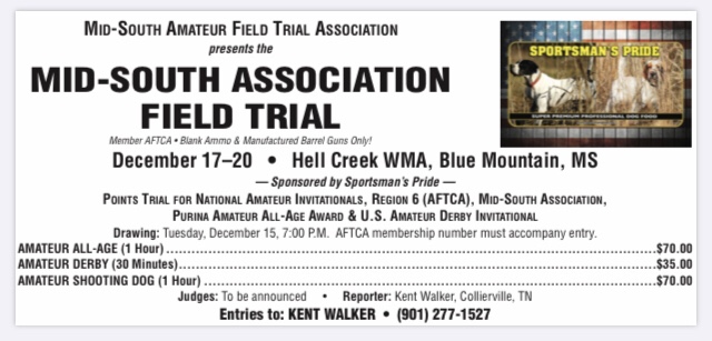 Just a friendly reminder that the Mid-South Association Amateur Field Trial drawing is on Tuesday, December 15th at 7 pm. Please contact Kent Walker with your entries!