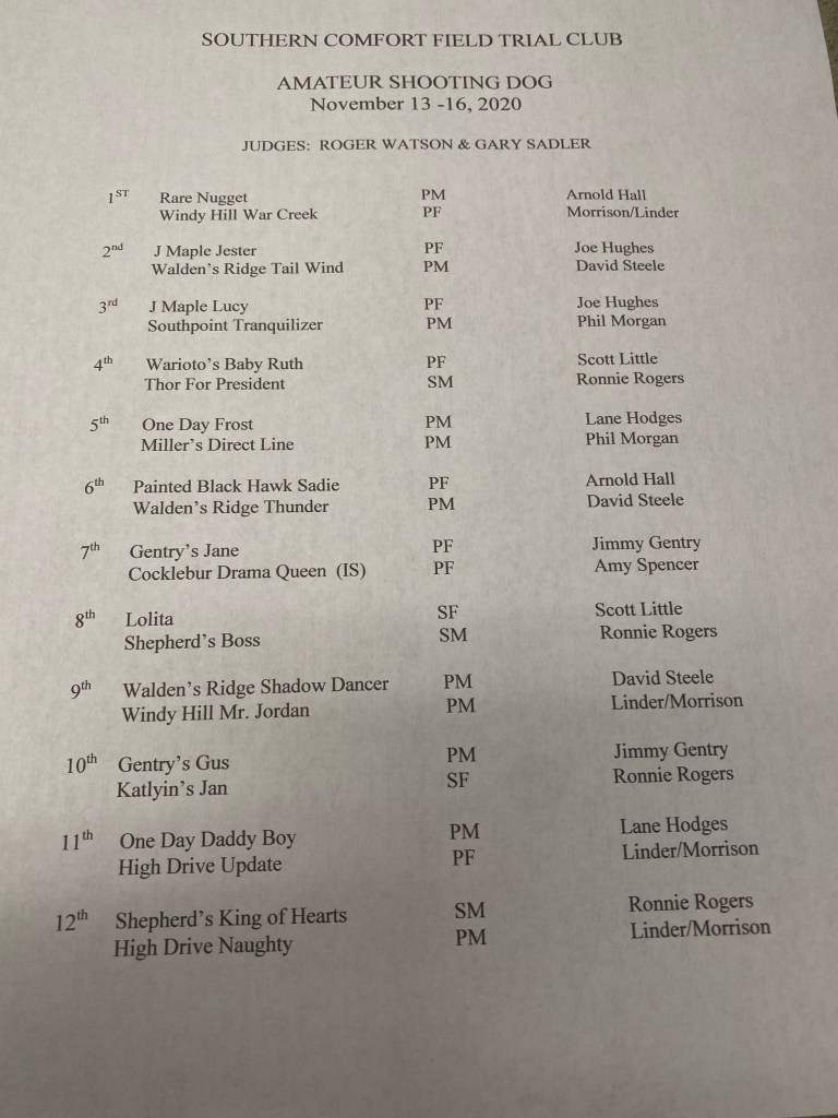 Southern Comfort FTC running order, trial will begin Friday, November 13th , at 7:30 am with the Amateur Shooting Dog Stake