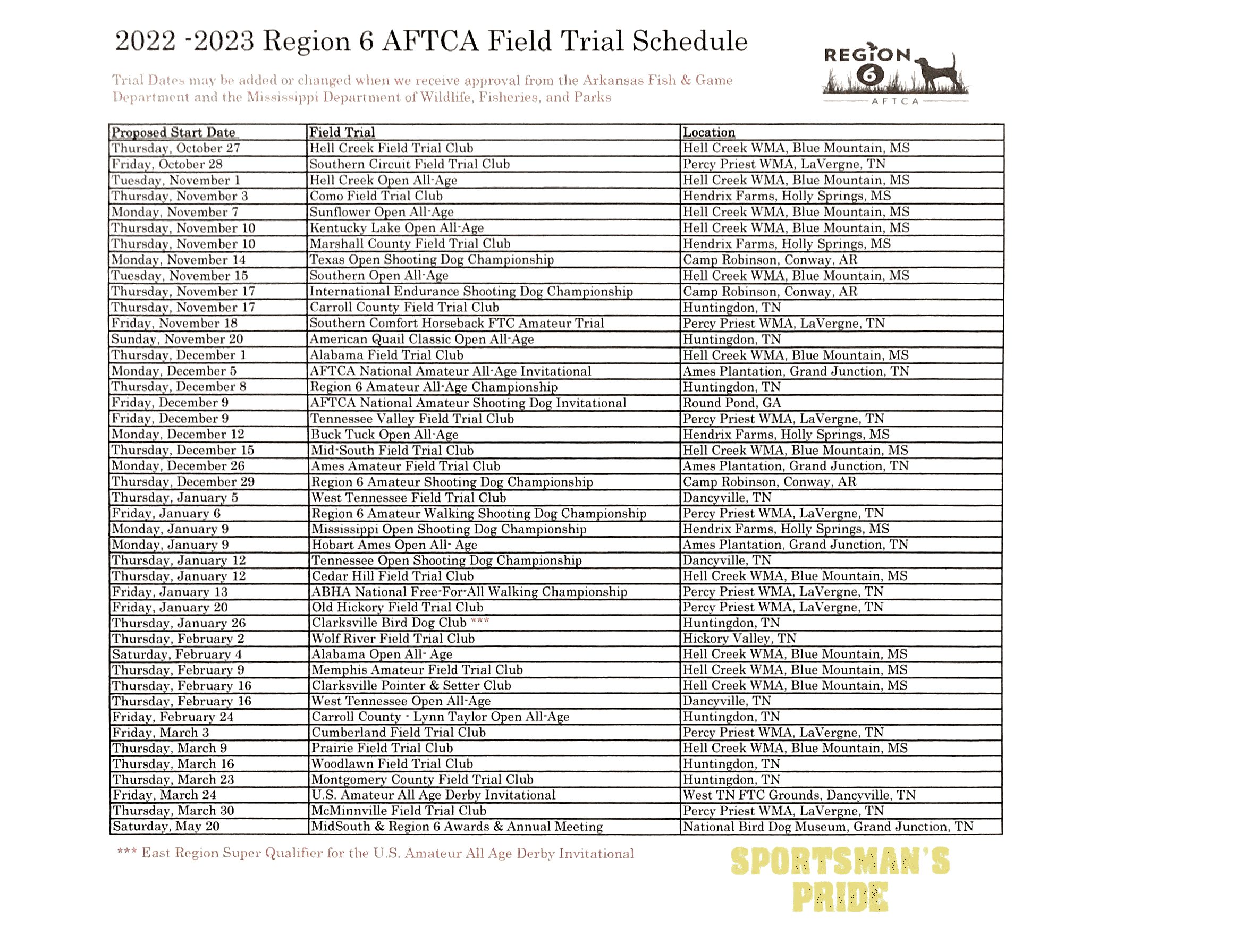 Please see the attached running order for the Southern Circuit Amateur Field Trial. The trial will start on October 29th with the Amateur Shooting Dog Stake, followed by the Amateur Derby Stake. We will all the competitors the best of luck! A special thanks to Sportsman’s Pride for their sponsorship. #SportsmansPride #aftca #region6aftca #fieldtrials #birddog