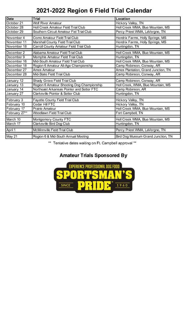 We are excited to announce that Sportsman’s Pride will be continuing their sponsorship of several amateur field trials in Region 6 during the 2021 -2022 field trial season. Sportsman’s Pride is a division of Sunshine Mills, Inc. which is based in Red Bay, Alabama. Sportsman’s Pride produces many professional, specialty, and limited ingredient dog food formulas. You can find descriptions of these feeding options for your canine athlete at https://www.sportsmanspride.com/dog. A special thanks to our own Kent Walker and Amy Spencer, plus Ryan Brown of Sportsman’s Pride and Rickie Hitt of Sunshine Mills for their efforts in creating this sponsorship package,